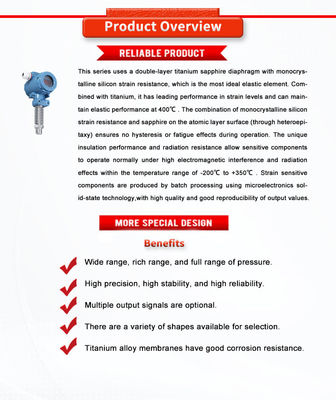 P1: ¿Cuáles son sus condiciones de embalaje? Respuesta: Por lo general, las cajas de cartón marrón están envasadas con bolsas de burbujas dentro para envolver el producto. P2: ¿Cuánto tiempo es válida su cotización? Respuesta:Nuestro presupuesto es válido por 30 días. Q3. ¿Cómo es su tiempo de entrega? Respuesta: Tipo estándar general: 7-15 días hábiles después de confirmar el pedido basado en la cantidad; tipos no estándar requieren comunicación y confirmación con nosotros.Cuarto trimestre. ¿Cuál es su cantidad mínima de pedido? Respuesta: De acuerdo con los diferentes tipos de productos, el costo varía y la cantidad mínima de pedido también varía. Por favor, póngase en contacto con nosotros para la confirmación.¿Cómo se asegura una buena calidad del producto?Respuesta: Tenemos un sistema completo de control de calidad; Todos nuestros productos son sometidos a una inspección exhaustiva por el departamento de calidad antes de ser enviados a los clientes.¿Puedes producir basado en muestras?? Respuesta: Sí, podemos producir de acuerdo con sus muestras o dibujos técnicos. Q7. ¿Puede aceptar marcas OEM? Respuesta: Sí, podemos aceptar marcas OEM. Q8.¿Cuánto dura el período de garantía de su producto?Respuesta: Mantenimiento de por vida, 24 meses de daños no causados por el hombre (calculados a partir del momento de la recepción), con sustitución gratuita si hay problemas de calidad (daños causados por factores humanos, uso de sobrecarga, etc.).etc.. no están incluidos en el ámbito de la garantía); sólo se cobrarán cargos por materiales más allá del período de garantía. Los accesorios y regalos no están cubiertos por la garantía.Para su comodidad, podemos enviar bienes a través de DHL, TNT, UPS, SF, EMS, etc. para envío prepagado, o usar su propia cuenta de mensajería para cobrar los gastos de envío.Puede ponerse en contacto con nosotros para ayudarle a obtener las muestras lo antes posible. Guía de compra Para recomendarle el sensor más adecuado, por favor díganos la siguiente información. 1. Temperatura de trabajo: -40~+125 °C? 2. Rango de prueba? 3. Salida: 4-20mA, RS485 u otros? 4.1/4NPT, R1/4, M20*1.5? 5. Conexión eléctrica: DIN43650, Packard, plomo directo? 6. ?